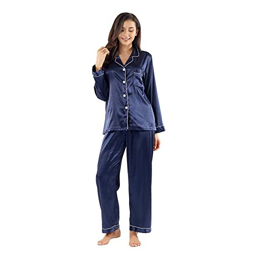 Gaeshow Pyjamasset för kvinnor, silke, satin, pyjamasset, långärmade, sovkläder, myskläder för alla årstider, Mörkblått, M