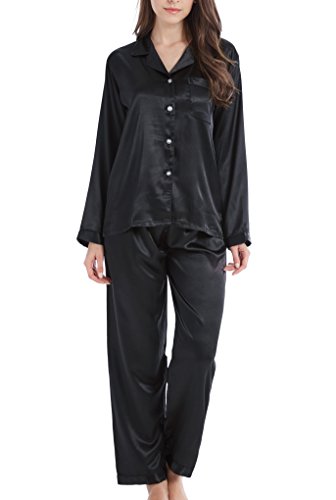 Gaeshow Pyjamasset för kvinnor, silke, satin, pyjamasset, långärmade, sovkläder, myskläder för alla årstider, Svart, S