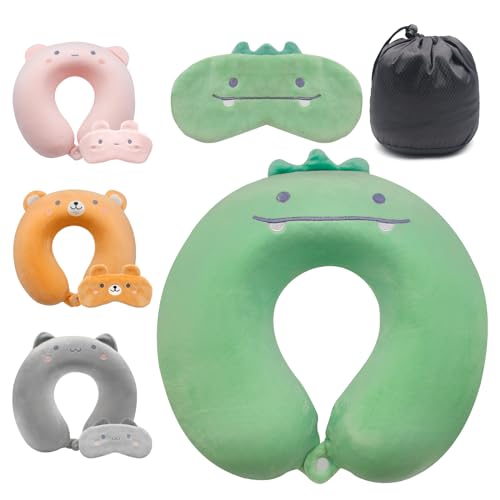 Lookka Resekudde, söt nackkudde för barn, nackstödskudde i minnesskum (tvättbart överdrag) med söt ögonmask för sovvila på flygplan lätt nackstöd för resor