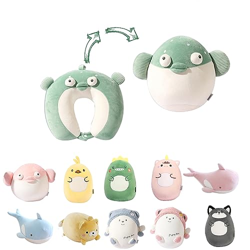 JOYRAVO Resekudde för barn, 2-i-1, mjuk och förtjusande plyschdjur som omvandlas till en U-formad nackkudde för ultimat komfort under resor med flygplan, tåg, buss, grön fisk