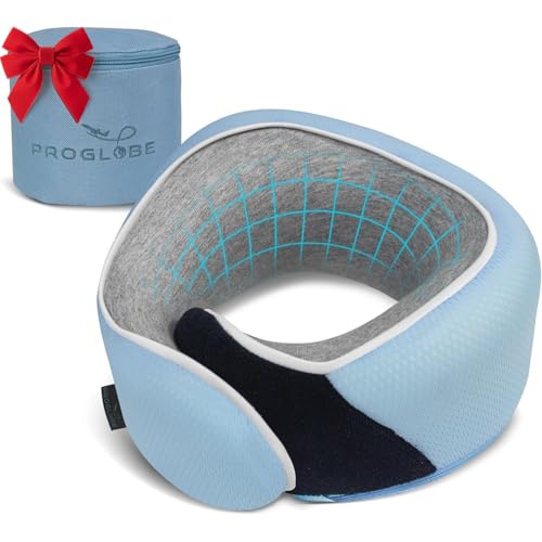 Proglobe Junior nackkudde för barn – ergonomisk reskudde i minnesskum för bil, flyg och tåg – mjuk, lätt och tvättbar – med justerbar velcro – ljusblå, 4–13 år