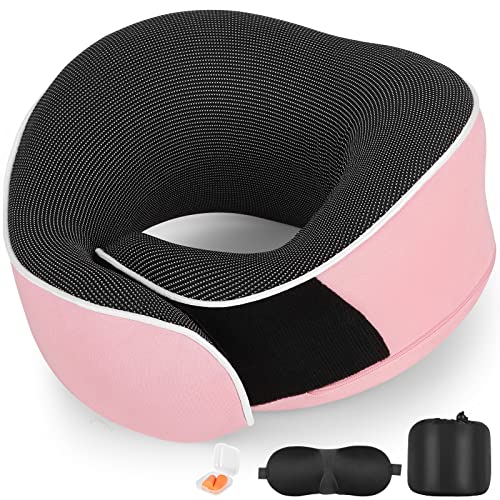 AYhome Resekudde, nackkudde i minnesskum för resor, bärbar flygkudde för nackstöd, nackkudde för resor för flygplan tåg med ögonmask och öronproppar (rosa)