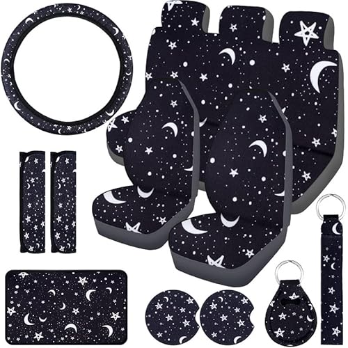 Frienda 15 delar måne och stjärnor bilsätesskydd fullt set för kvinnor män uppgradering tjocka främre skydd universell ratt separata nackstöd bältesdynor bil lastbil (stjärnmönster)