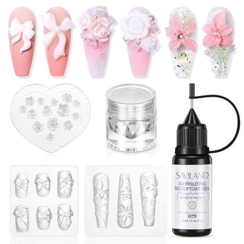 SAVILAND 3D Gel Nail Art Mold Kit: 3 st rosa silikongjutform/falsk nagel, 10 ml 3D-gel för naglar, krompulverpärlor, formlim kit för nybörjare DIY blomskulptering