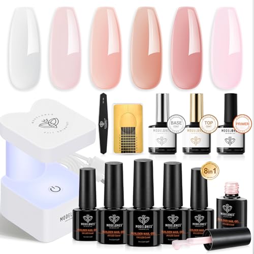 Modelones Builder Gel Nagel Kit, 6 Färger 7ml Builder Gel med 8W UV-Lampe Nageltorkar Top Base Coat Nail Dehydrator för Nagelförtjockning, nagelkonst Nail Art Kit