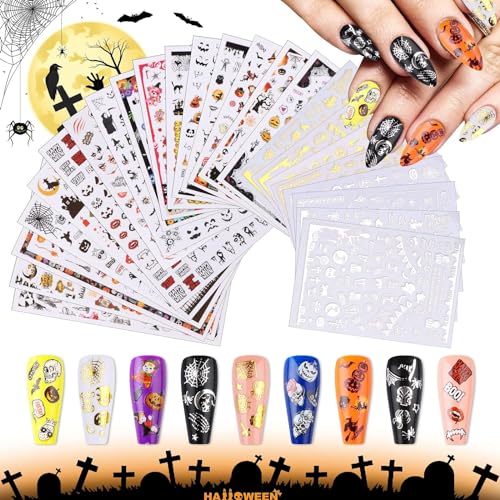 Kalolary Halloween Nagelkonst Dekaler, 24 Ark Självhäftande DIY Nagel Klistermärke Dekaler Guld och Silver Färg Nageldekaler för Kvinnor Flicka Halloween Naglar Dekorationer