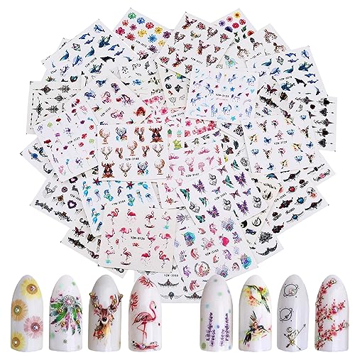 MWOOT 48 ark nagelklistermärken, nagelklistermärken vattentransfer klistermärken dekaler med djur blommor fjäril drömfångare mönster, nageltatuering klistermärken för gör-det-själv nageldesign