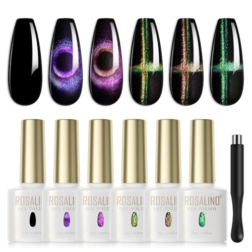 ROSALIND UV-nagellack magnetisk uppsättning 9D Cat Eye Gel nagellack Set Gel nagellack svart 6 färger Set nagellack Cat Eye Soak Off UV-gelpolish med magnetisk penna