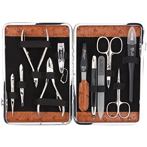 Tre svärda Tyskland manikyrset "Fano` nagelset med nagelsax, hudsax, nageltång och mycket mer – 11 delar i robust ramfodral – konjak/bukettsimitation