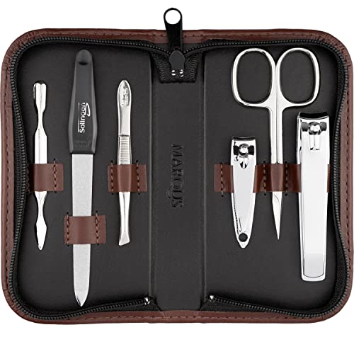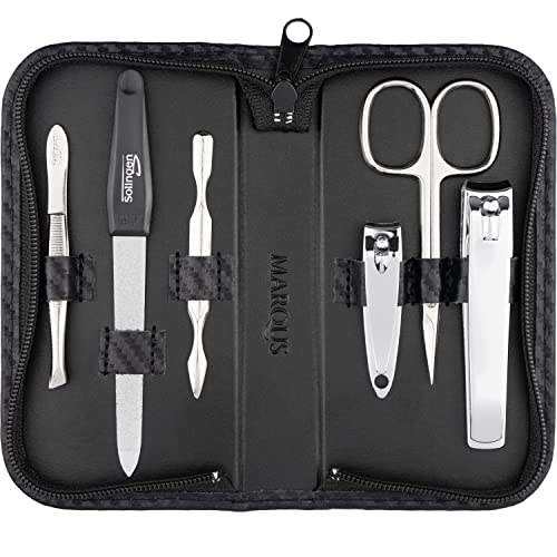 Manikyrset Solingen - Jämförelsevinnare med bästa pris/prestanda - Äkta läderfodral praktiskt och mjukt - 7-delat nagelset för kvinnor och män marQus av glänsande förnicklat polerat stål