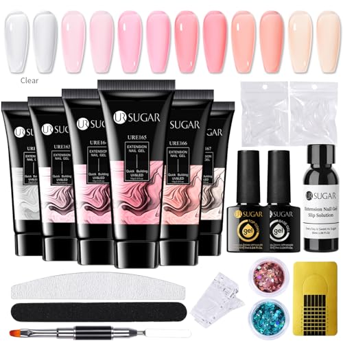 UR SUGAR Poly nagelgel kit gelé rosa, 6 färger rosa transparent hudfärgad poly gel förlängning nagelset alla årstider byggare förbättring startkit med glidlösning grundläggande manikyrverktyg