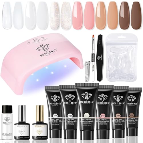 Modelones Polygel startset med UV lampa, 20 W, polygel, nagelset, 6 färger och slip lösningsbas, topp, rock, naken, rosa, akrylnaglar för nageldesign, gör-det-själv, alla hjärtans