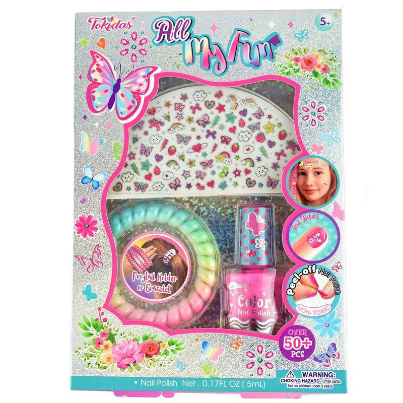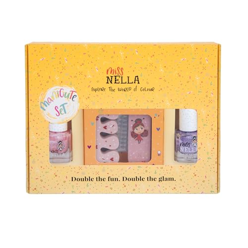 Miss Nella Glitter MANICUTE – nagelset för barn + 2 Miss Nella borttagningsfärger, nagelklistermärken, tatueringar, nagelfil och tåseparator – utformad för barns händer och tår