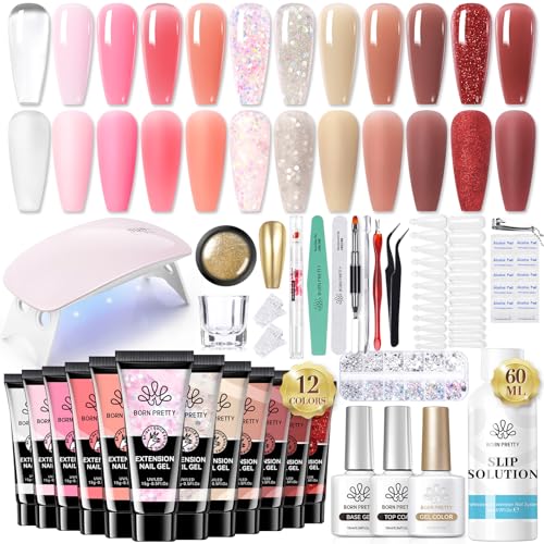 Born Pretty Startset med polygel och UV-lampa, nagelset i polygel, 12 färger, ljus nude, rosa, nagelförlängning, bas- och topplack – allt-i-ett-lösning