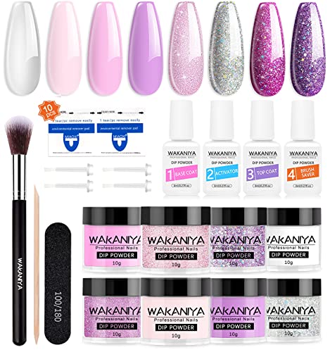 Wakaniya 8 färger klar rosa glitter dopppulver nagelset – startkit med aktiverare och borsthållare – dippmanikyrkit för nybörjare