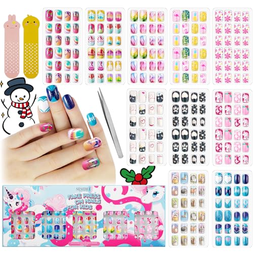 SUPYINI Barn Lösnaglar Kit, 120 St Färgglada Förlim Heltäckande Tryck På Naglar, Kort Lösnaglar