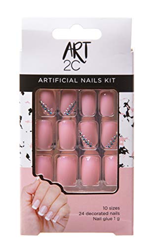 Art 2C - konstgjort nagelset, med lim, matchande form, lätt att ta bort, 24 dekorerade naglar, 10 storlekar – rosa/glänsande strass, 040