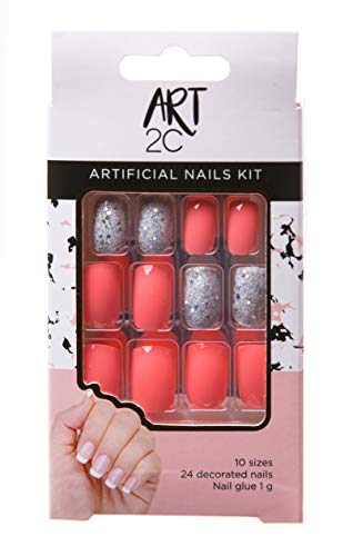 Art 2C - konstgjort nagelset, med lim, matchande form, lätt att ta bort, 24 dekorerade naglar, 10 storlekar – rosa och silverglitter, 039