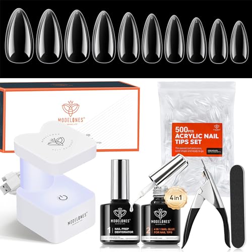 modelones American Nail Kit, 500 st Lång Transparent Press på, Naglar Med Ultraportabel Led Nagellampa och Lim för Nagelkonst och Avvattningsmedel, för Akryl Nagelförlängning Nail Art DIY