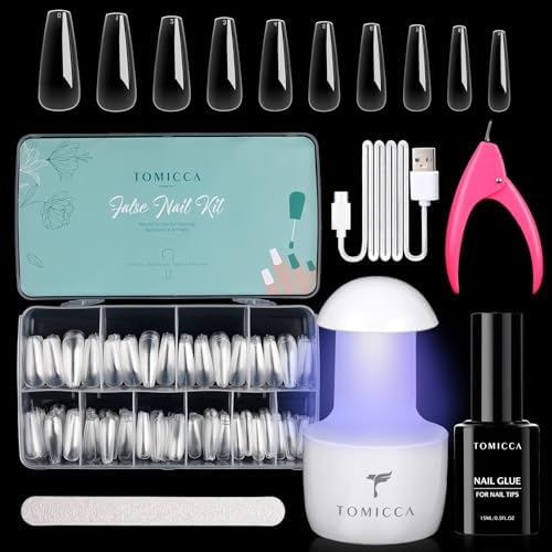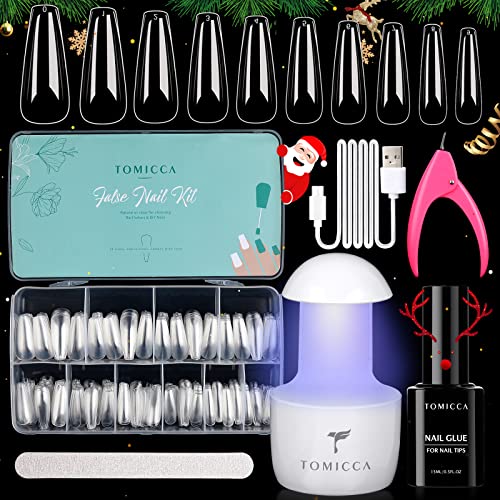 TOMICCA American Nail Kit, 500 st Lång transparent press på naglar med ultraportabel led nagellampa och 15 ml nagellim för akryl nagelförlängning Nail Art DIY