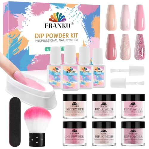 15 stycken Dip Powder Nail Starter Kit, EBANKU 6 färger Nude Pink Glitter Nail Dip Powder Kit med Dip Liquid Set Base/Top Coat Activator Brush Saver System Essential Kit för Fransk Nagelsalong DIY