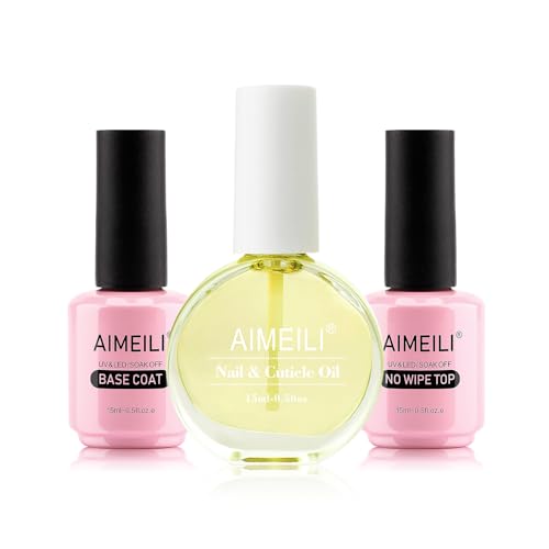AIMEILI No Wipe Top Coat Base Coat med Cuticle Oil Set, Nail Treatment Set, 3Pcs Upgraded Formula Gel Nail Polish Nail Oil Set för torra och skadade nagelband, Soak Off UV LED Gifts Long-Lasting 15ml
