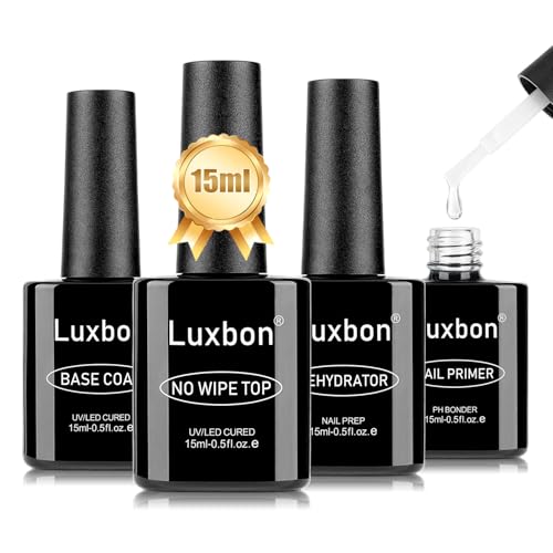 Luxbon 4 st 15ml No Wipe Gel Top Coat och Base Coat Nail Primer Dehydrator Set - Långvarig, glansig finish, UV LED nagellampa Soak Off Gel Base Top Coat Manikyr