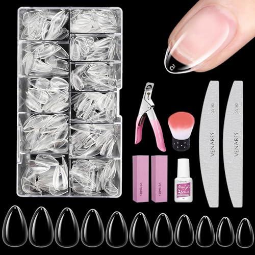 Venares 500 stycken extra kort mandel mjuk gel, konstgjorda nageltips, set med självhäftande filer, nagelpuffert nagelborste, 11 storlekar, fullskydd, XS, Short Almond Nail Tips set för gelnaglar