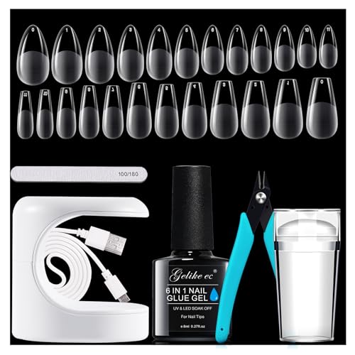 Gelike ec Nail Tips and Glue Gel x Nail Extension Set Mini Nagellampa och 6-i-1nagellim, 240 st mjuk gel full cover nageltips, fransk nagelstämpel, nagelklippare medium mandel och kvadrat