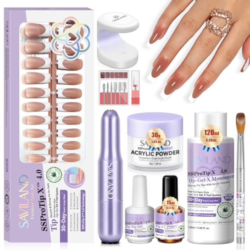 Saviland French Tip Acrylic Nails Kit: In-minute Long Wear & Easy French Acrylic Press-on & Thick Short Square Vit Tip 150PCS Pro Acrylic Nail Kit Pulver Monomer Liquid (rektangel)