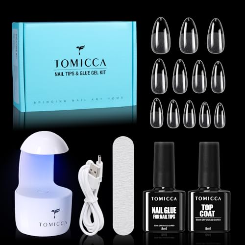 TOMICCA Gel Nail Extension Set With 6-in-1 Glue and 240 Medium Almond Tips, Top Coat for Artificial Nails With Mini UV Lamp