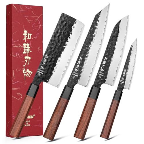 HEZHEN köksknivset 4PCS, stålpläterad kockkniv Nakiri smidd stål Santoku, oktagonalt trähandtag