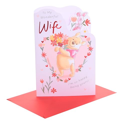 Brittiska hälsningar | Alla hjärtans dagskort för fru | I Love You presenter | Henne, flickor, kvinnor | Nalle Puh med bukett design | med kuvert | 15,9 x 22,9 cm