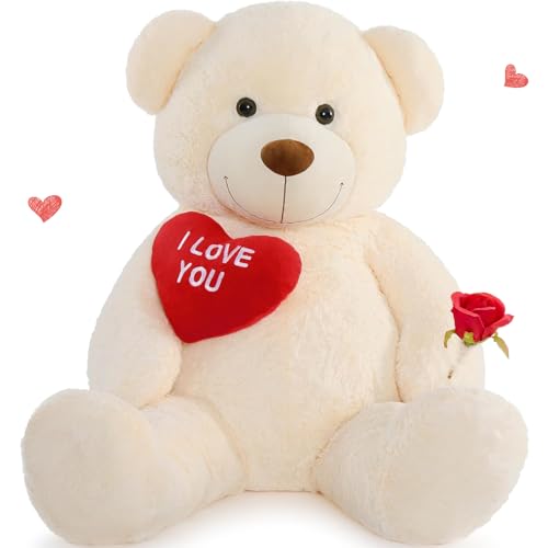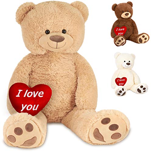 MorisMos 90 cm jätte nallebjörn med rött hjärta I Love You, XL Kawaii Plyschbjörn Beige Stor Mjuk, Alla hjärtans dag Present till Flickvän Kvinnor Flickor Fru Baby Födelsedag
