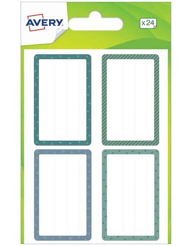 Avery – Väska med 24 blå och gröna skoletiketter, 36 x 56 mm, vit med linjer, självhäftande etiketter för namn, förnamn och material, personliga klistermärken för skolan