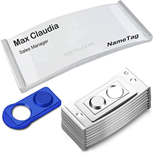 FIVAVA 10 stycken namnskylt för kläder, magnet med 2 starka magneter, pappersinsats, transparent, fashionabla välvda, 75 x 32 mm, silver