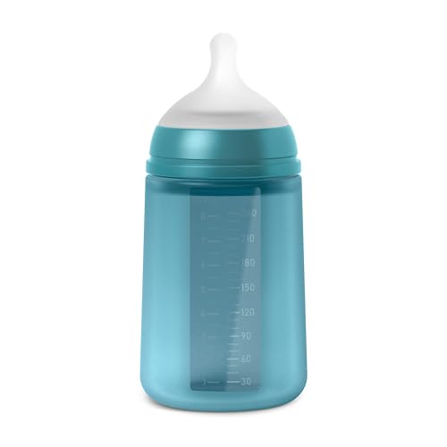 Suavinex, Flaska med silikonflaska och SX Pro symmetrisk napp, mjuk och flexibel, med anti-kolikventil, medelflödesflaska (M), för spädbarn + 3 månader. Färg essens, djup hav