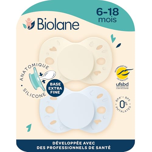 BIOLANE - Anatomisk napp - Extra fina nappar - 18+ månader - Tvåfärgad blå - platt, vändbar napp - Optimal komfort - Respekt för munutveckling - Säkra och hållbara material
