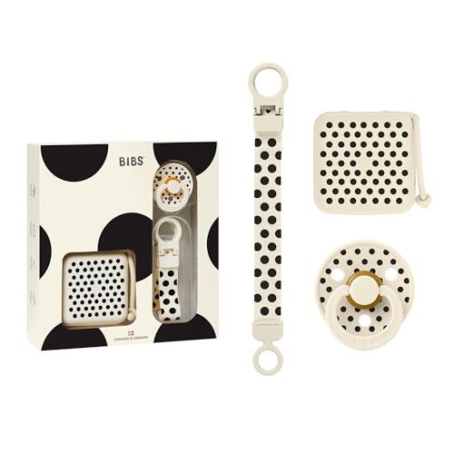 BIBS Gift Set Polka Soothe & Go, med BIBS Studio Polka Dots Colour-napp, nappask och napphållare, BPA-fri napp, rund sugdel. Naturlatex, storlek 2 (6–18 månader), Ivory