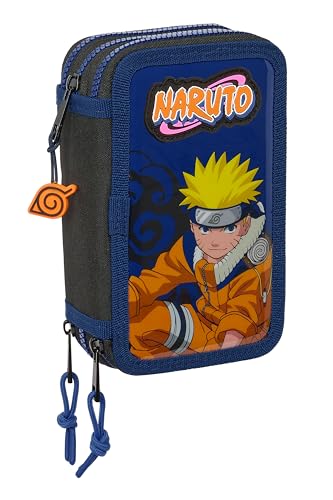 NARUTO NINJA - Skolväska med 36 användbara tillbehör, barnfodral, barnfodral, perfekt för barn i åldrarna 5 till 14 år, bekväm och mångsidig, kvalitet och styrka, 12,5 x 5,5 x 19,5 cm, svart/blå,