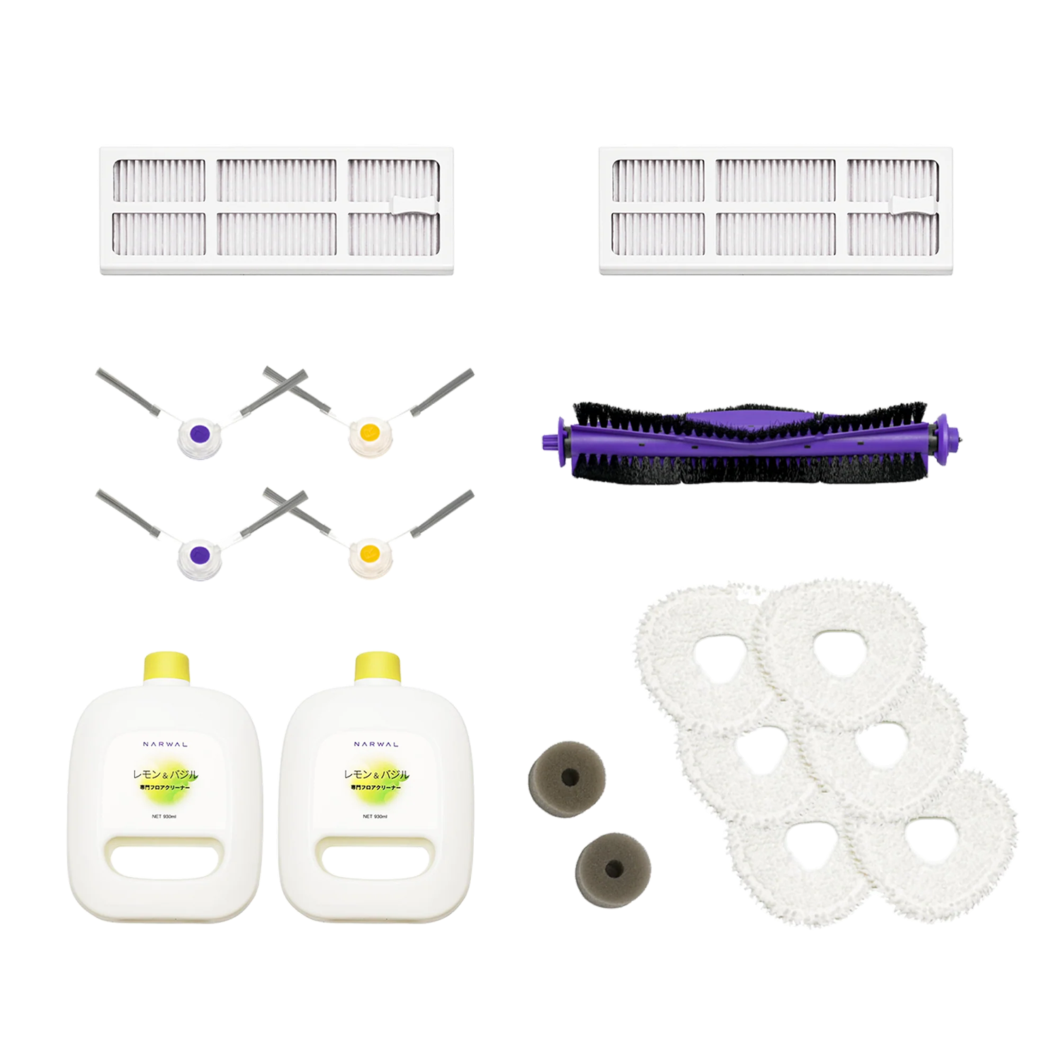 Narwal Freo Z10 tillbehör: 1 x huvudborste, 3 x torkdukar, 2 x sidoborstar, 2 x rengöringslösning, 3 x dammpåsar, 2 x HEPA-filter, 2 x vattentankfilter