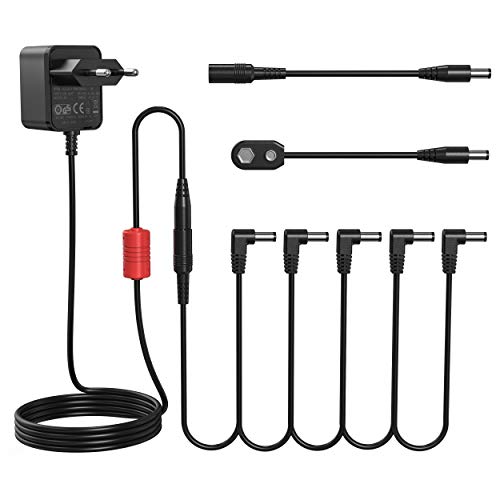 Effekttillbehör Nätaggregat 9V DC 1A Centralt Negativ Strömförsörjning Laddare Nätadapter med 5 Way Daisy Chain-Kablar för Gitarrpedal Elektrisk Gitarr Bas Effekt Pedal och Casio Piano Tangentbord