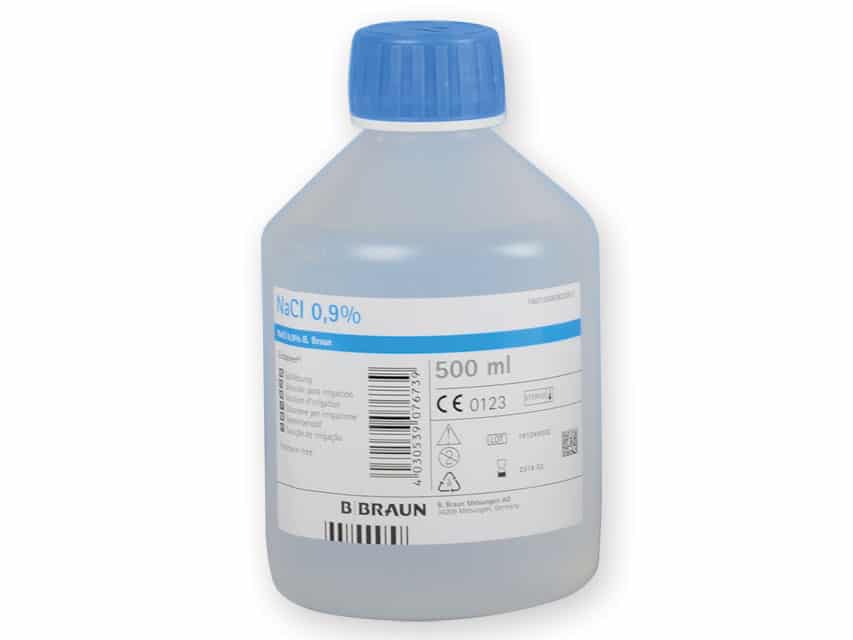 Baxter NaCl 0,9% natriumklorid (saltlösning) för bevattning. En liter (1 000 ml).