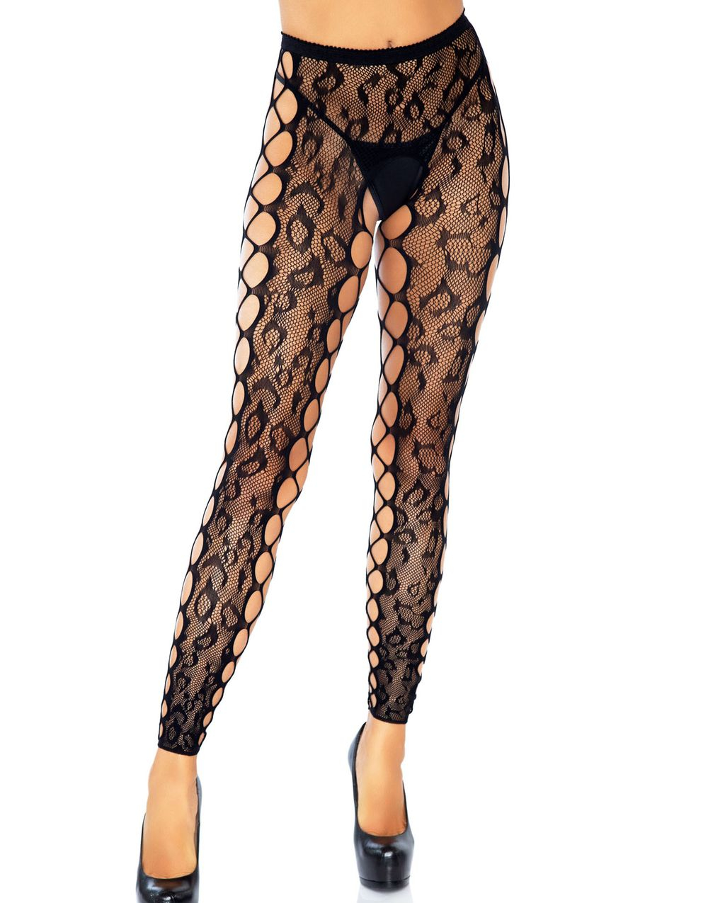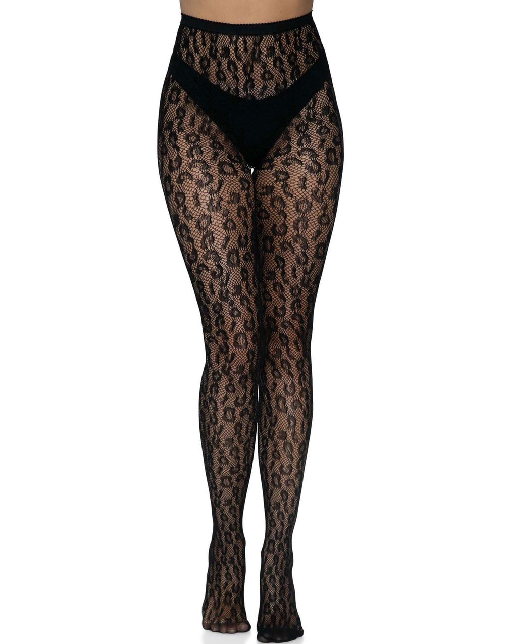 Svarta Crotchless Nätstrumpbyxor med Leopardmönster