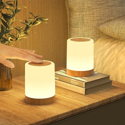 Bonsery LED-nattlampa, touch dimbar med 256 RGB-färger och 3 lägen, nattlampa barn, USB-uppladdningsbar med timing och minnesfunktion, bord av trä, trådlös för dekoration, sovrum, vardagsrum (2)