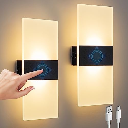 Vägglampor för inomhus, 2 st., med beröringsstyrning, dimbar nattlampa med batteri på 3 600 mAh, utan strömanslutning, trådlös, med strömbrytare, energisparande LED-läslampa för sängen i sovrummet