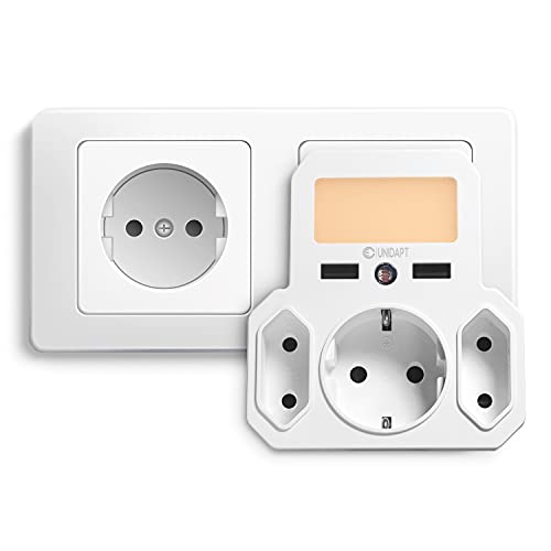 Unidapt USB-uttag med dimbar nattlampa & skymningssensor. 6-i-1 multipeluttag med 2 USB, 3 vägguttag med (2 Euro-uttag och 1 Schuko), kompatibel för iPhone, smartphone, bärbar dator mm