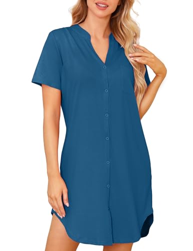 Lovasy Nattlinnen för kvinnor kortärmad bomull sommar sovskjorta amning nattlinne med knappar damer födelseskjorta med fickor, Koboltblå, S