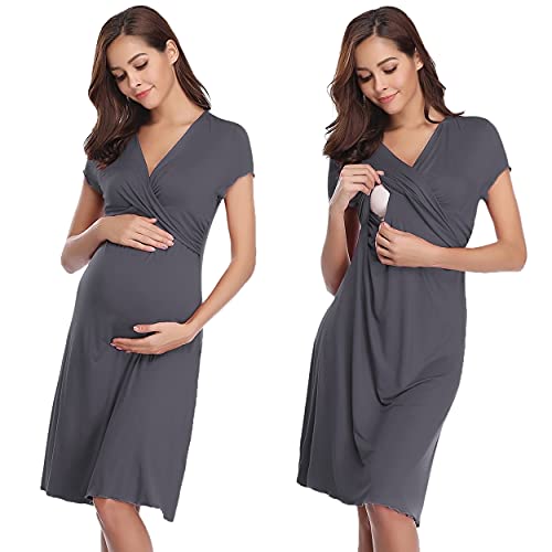 Amningsklänning för kvinnor moderskap nattskjorta amning nattlinne mjuk nattlinne v-ringad pyjamas myskläder för gravid ledig, Mörkgrått, L