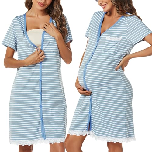 Litherday Nattlinne dam kortärmad nattskjorta dam bomull med knappar framtill sjukhus daglig amning bröst sovskjorta förlossning med fickor lätt och bekväm, Ljusgrå, M